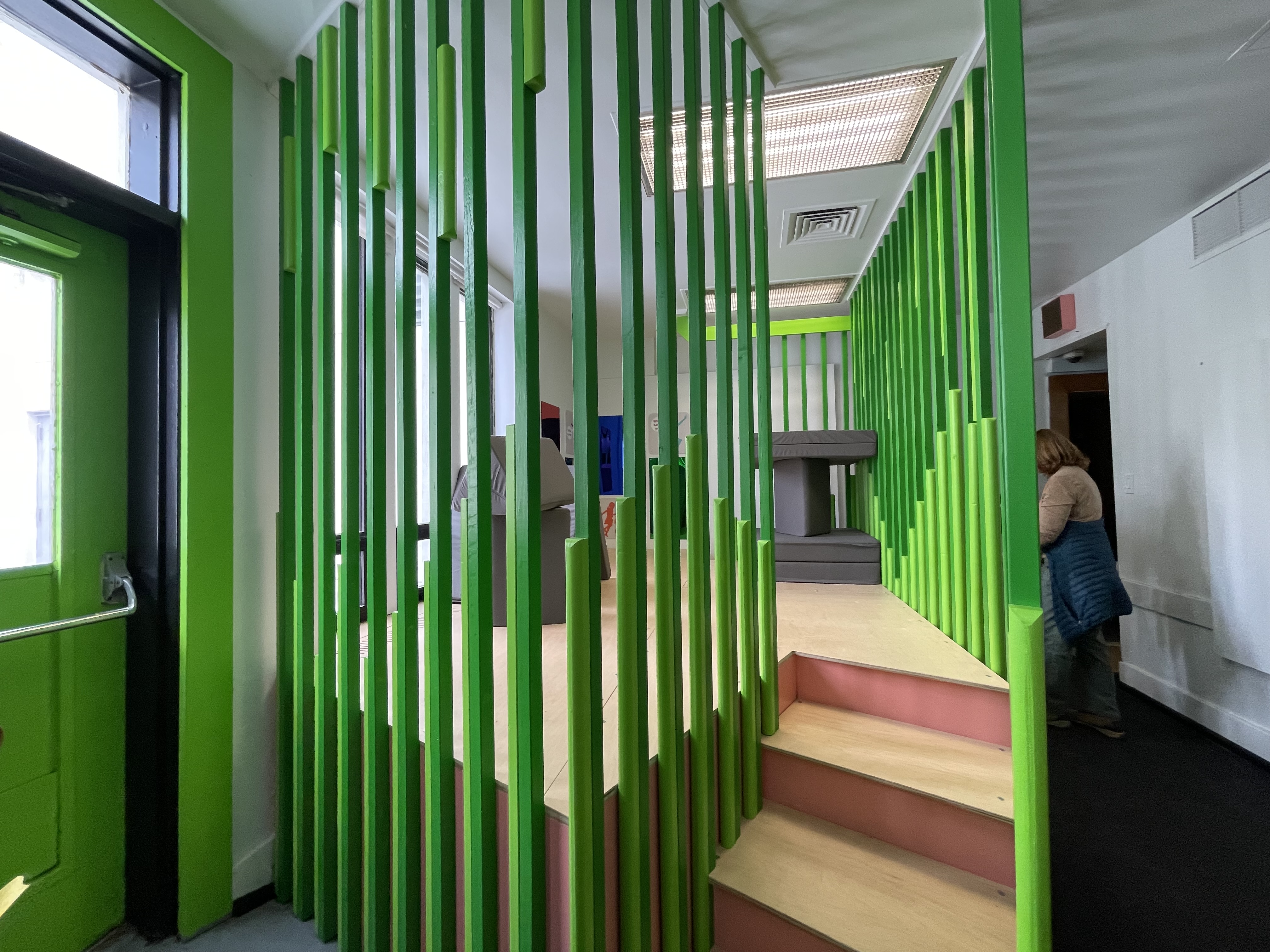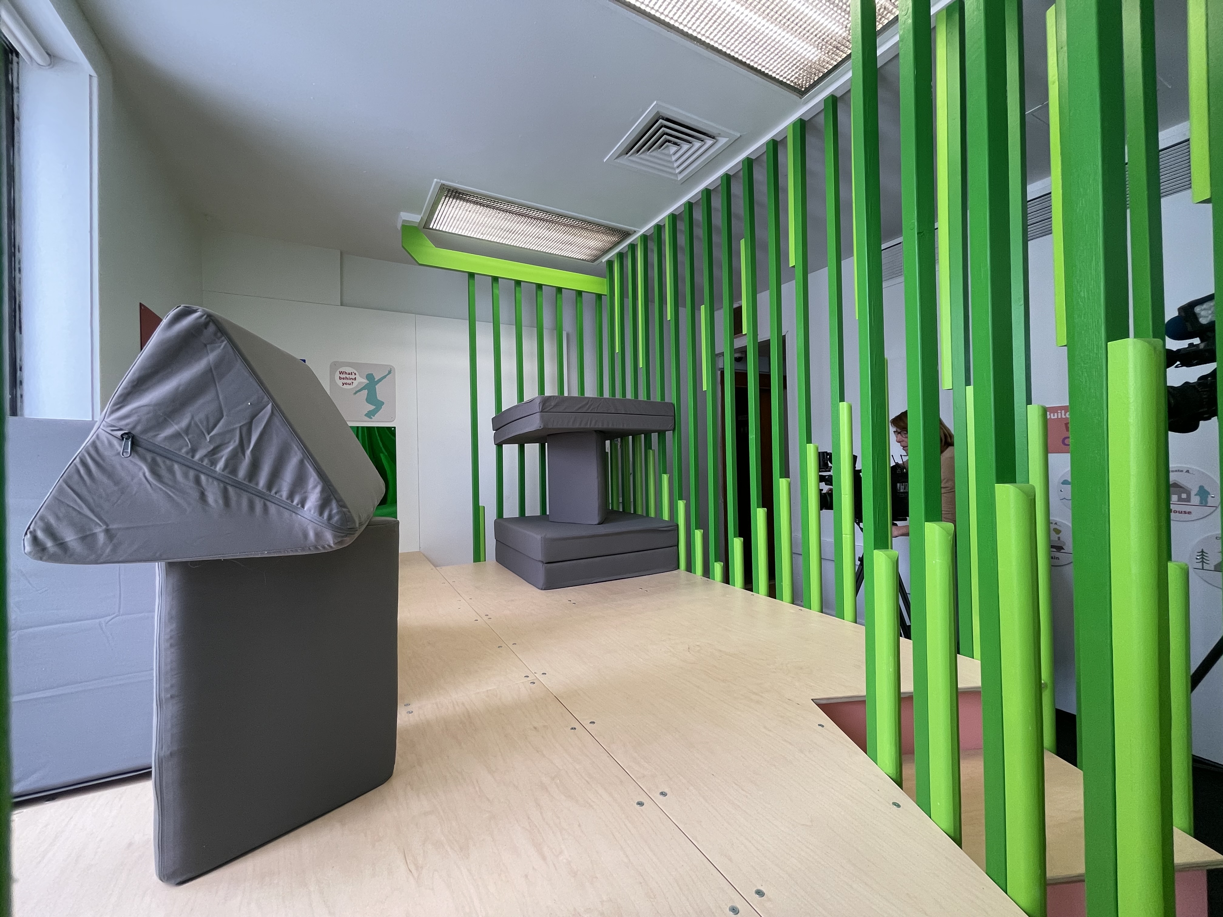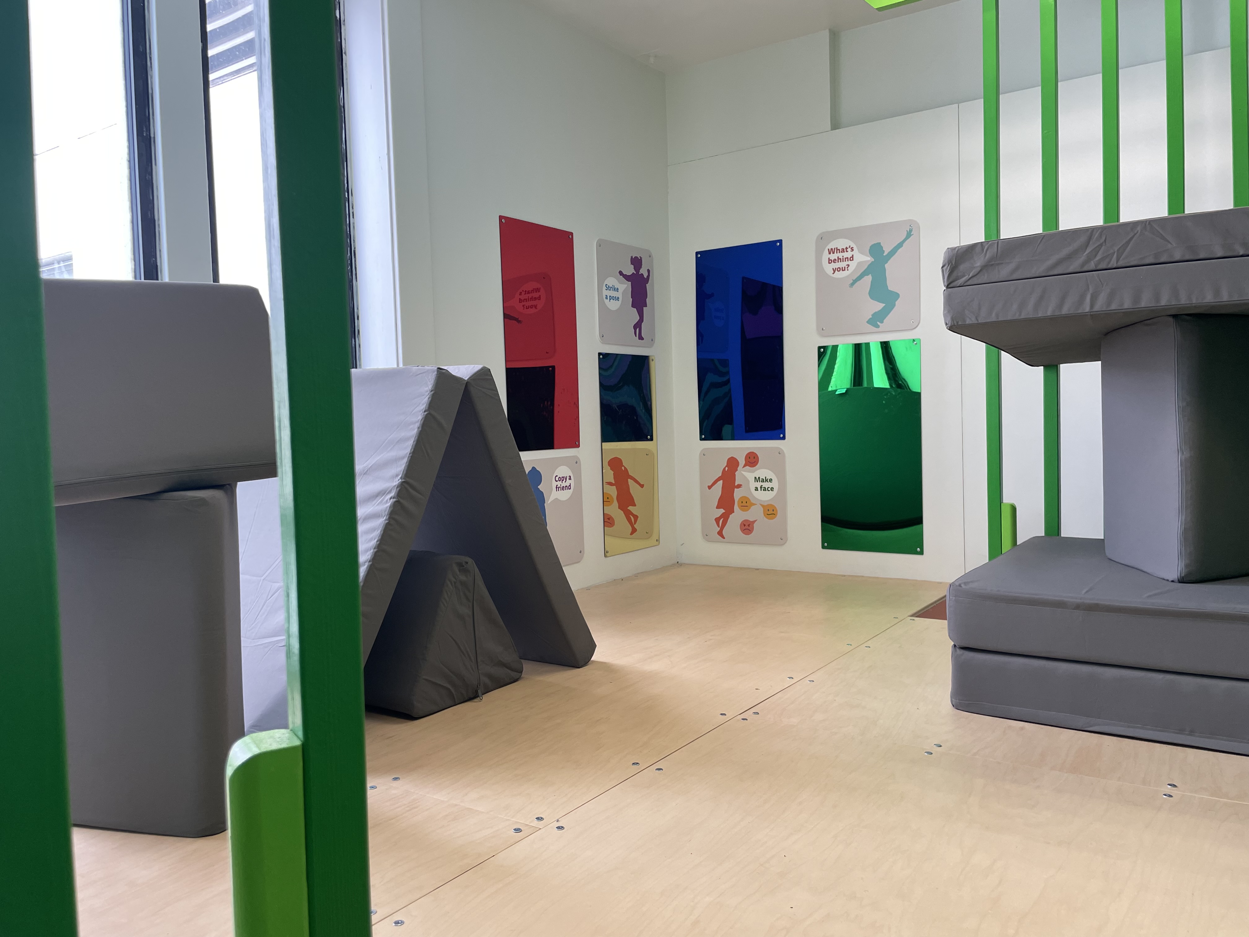 Surrounded by bright green pillars and elevated off the ground, the structure creates a lofted play area children can reach with a short flight of steps. Inside are grey triangular and square cushions that they can move and rearrange with signs along the wall encouraging them to create a boat, house mountain, train tree, or tent — continuing the imaginative fort-building that inspired the space.
