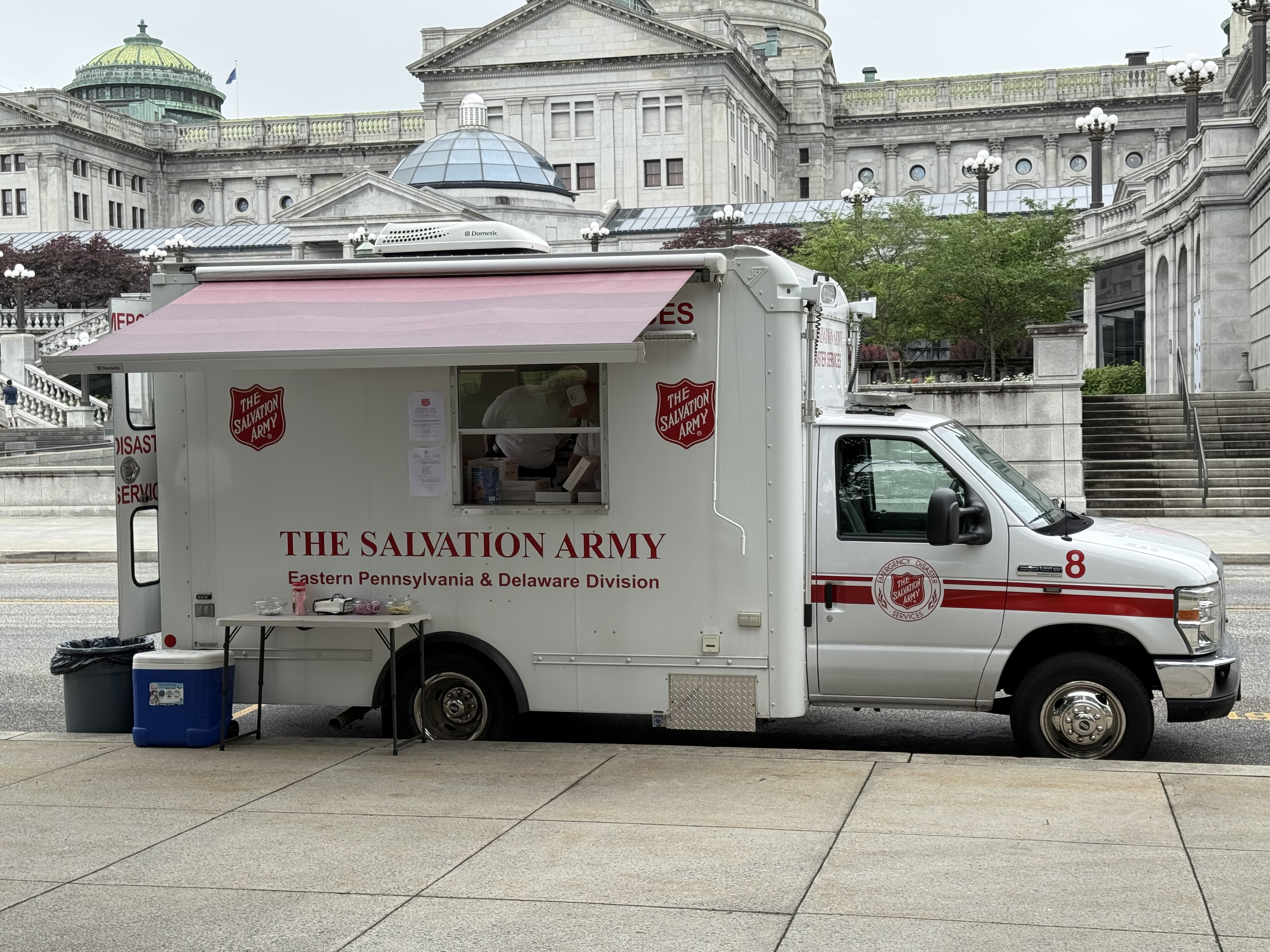 Eighty-seven years later, The Salvation Army Eastern Pennsylvania and Delaware Division celebrated this milestone again by hosting Donut Day at the State Capitol Building in Harrisburg. Our Emergency Disaster Services (EDS) team distributed free coffee and donuts from an EDS vehicle, also known as a canteen, stationed behind the Capitol at the intersection of Commonwealth Avenue and North Street.