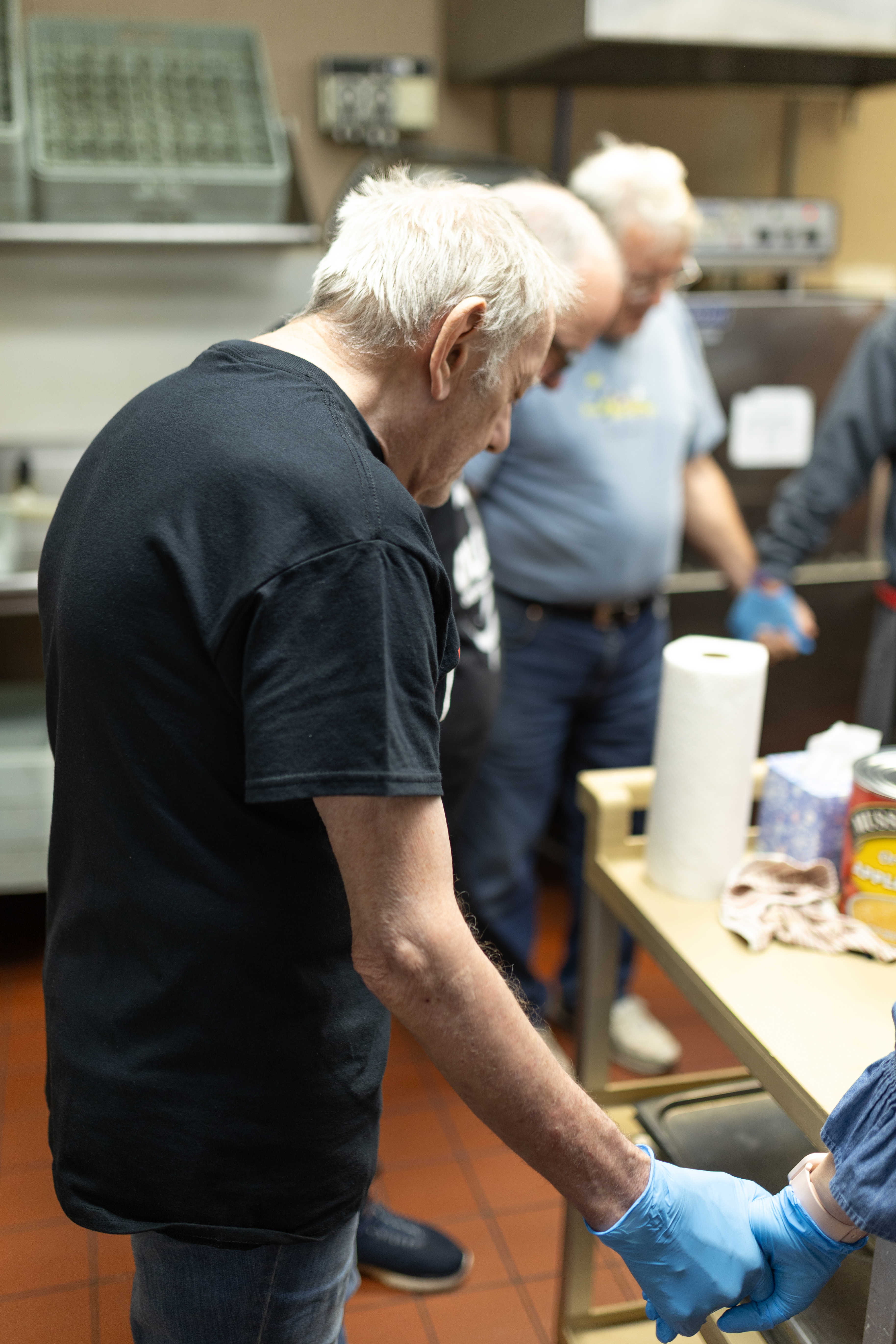BLESS THIS TIME George Boychock holds hands and prays with others before his shift in the kitchen at The Salvation Army.