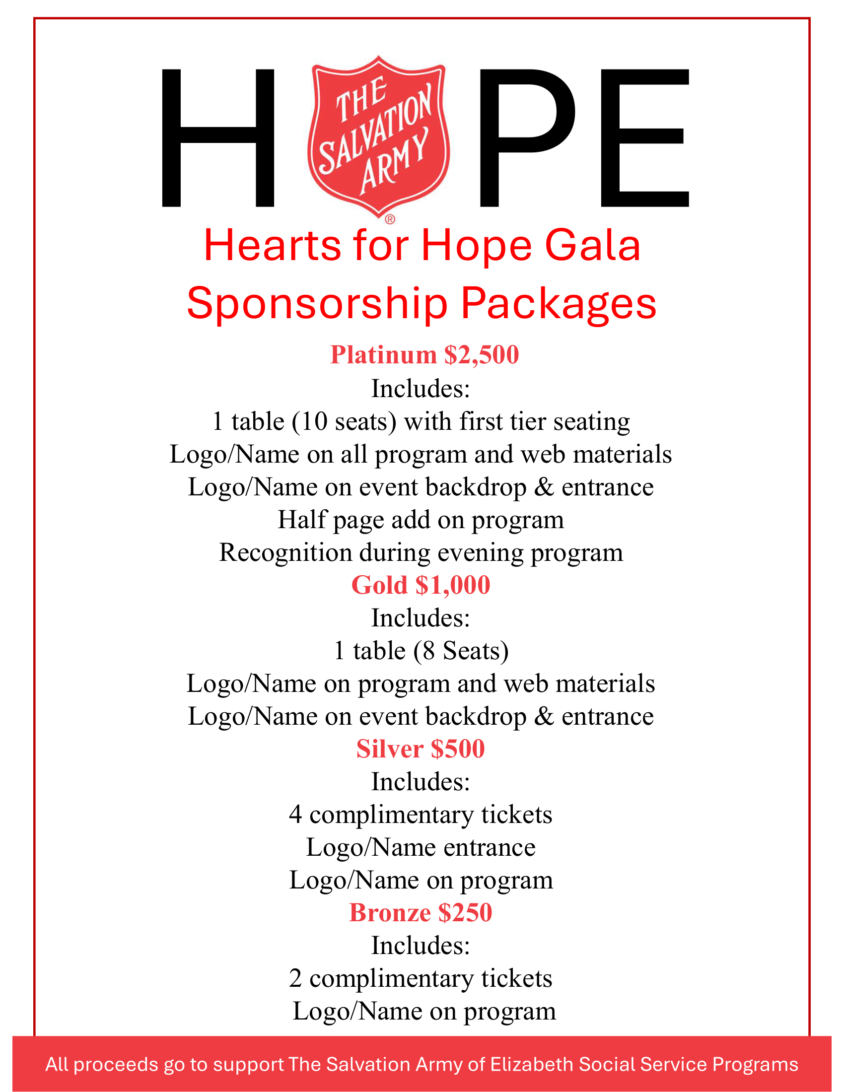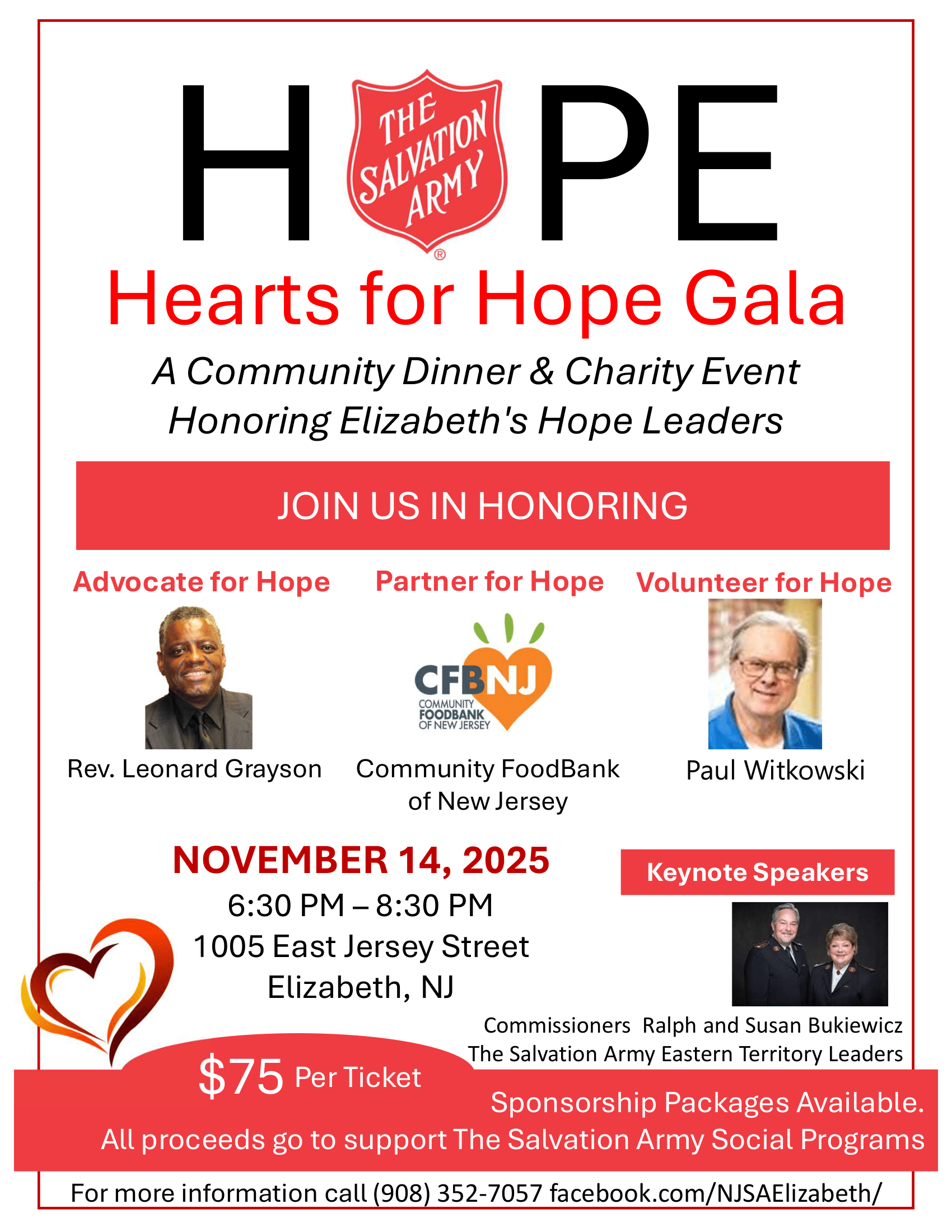 Register NowThe Salvation Army appreciates and honors the partners that join us in bringing Hope to the city of Elizabeth and surrounding communities. On November 14, 2025, The Salvation Army will launch its first Annual “Hearts for Hope” Gala. This event is a community dinner and charity event to honor Elizabeth’s Hope Giving leaders. This event will honor: