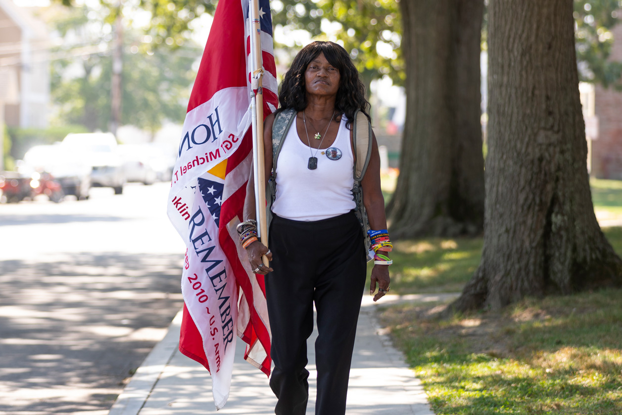 Beverly also carries a large, green military backpack decorated with images of four–leaf clovers, military symbols, and the names and faces of young vets who have lost their lives. Through her efforts, Michael Franklin’s legacy is still helping to save others.