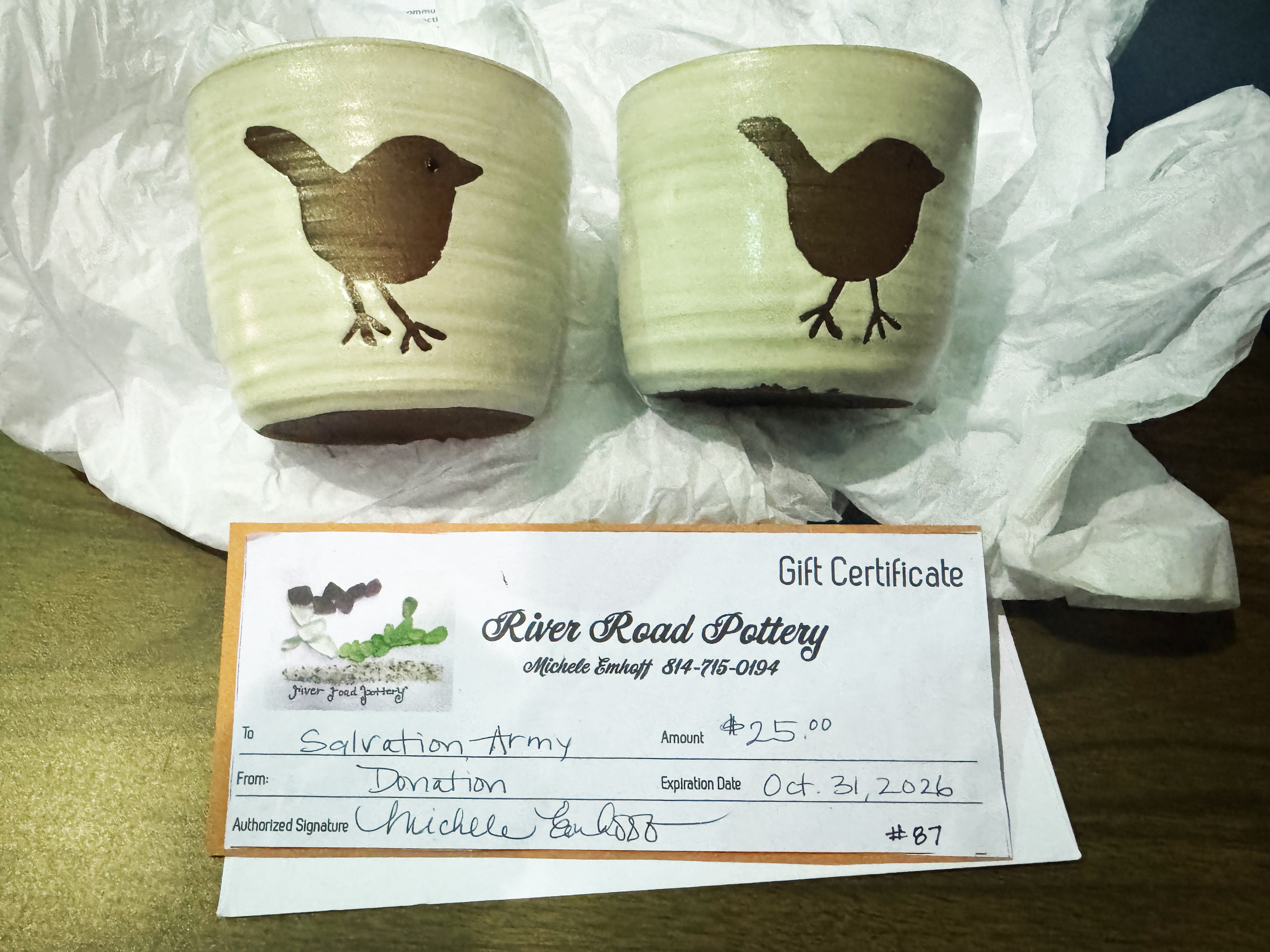 1110 - River Road Pottery - 2 Soup Cups and $25 Gift Certificate